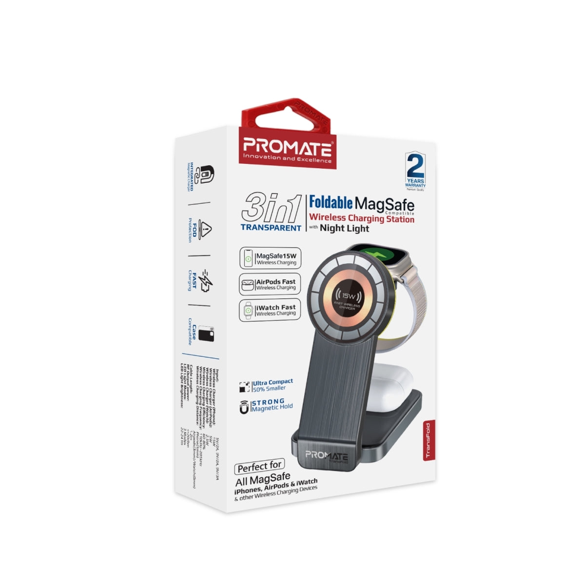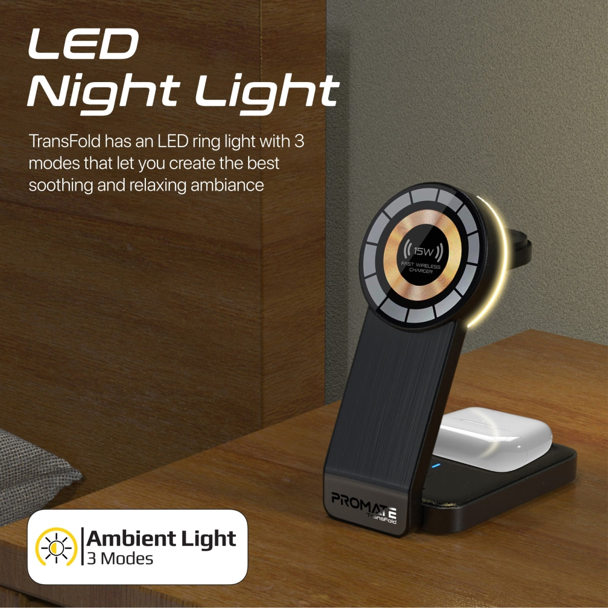 Eliminate the hassle of tangled charging cables, multiple adapters, and the search for sockets with TransFold, the ultimate 3-in-1 charging solution for your devices. With dedicated charging modules for your smartphone, Apple Watch, and AirPods/AirPods Pro, this unique foldable design offers a one-of-a-kind charging experience. The wireless charging station also features an LED ring light with 3 modes to create a soothing and relaxing ambiance.