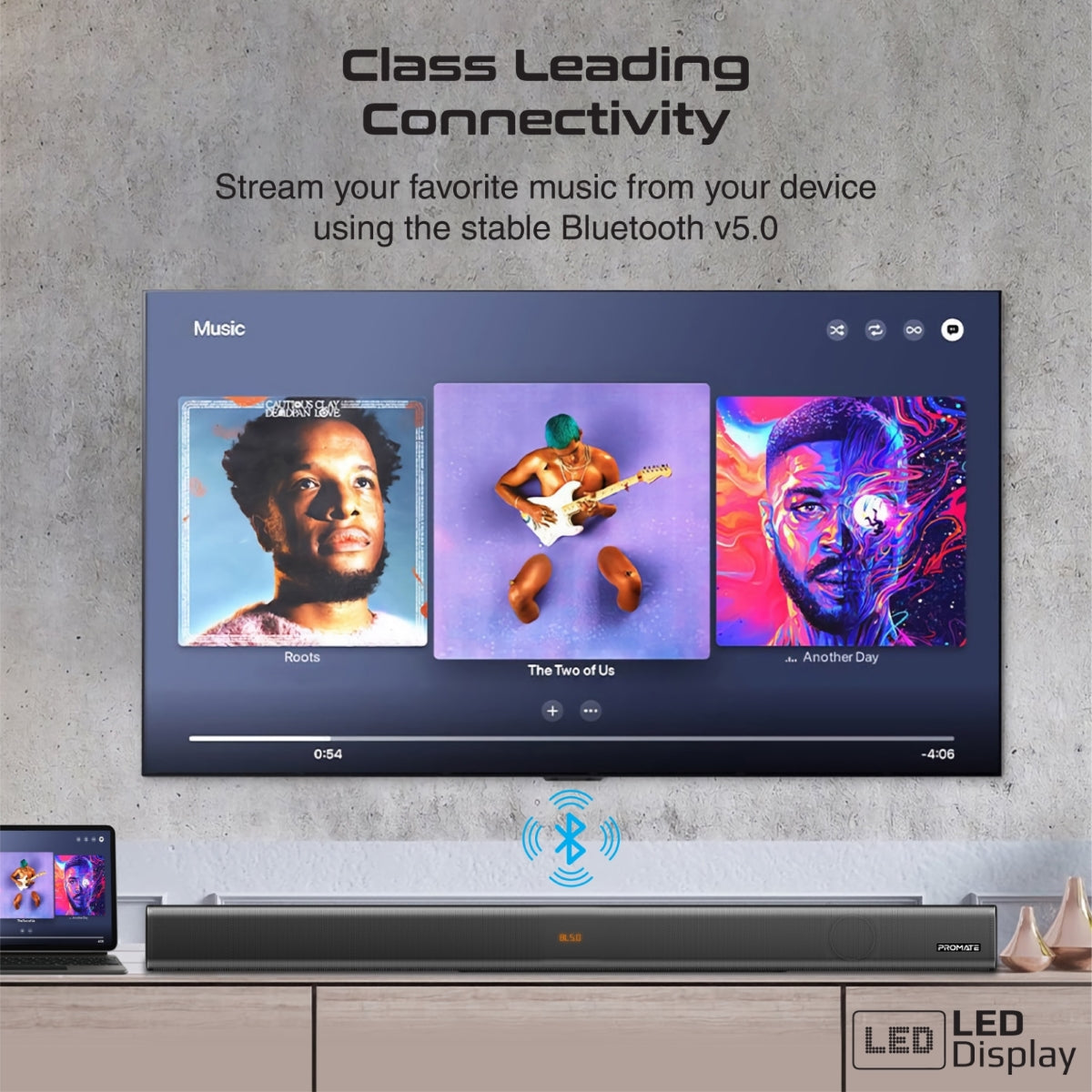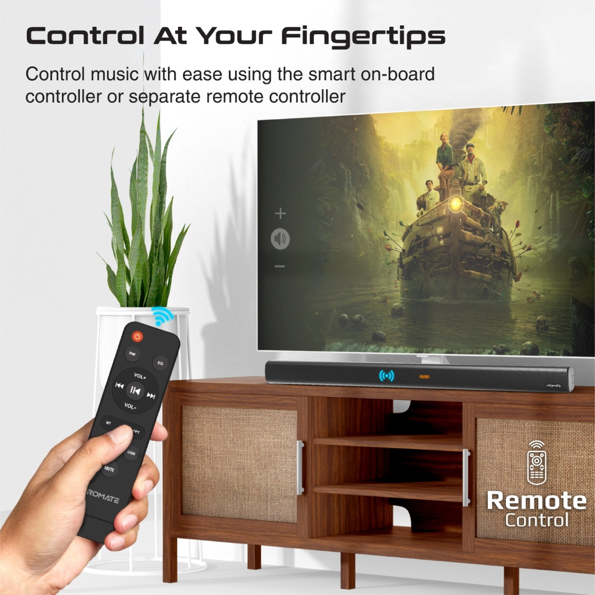 Immerse yourself in cinematic audio and powerful bass with the StreamBar-60. Boasting a potent 60W deep bass speaker and a built-in 28W subwoofer, this soundbar delivers advanced audio performance, enhancing the overall experience. With Bluetooth v5.0 and additional AUX-in, USB, HDMI, and Optical-in ports, enjoy seamless connectivity and easy music playback. The StreamBar-60 is equipped with on-board controls and also includes a remote controller, providing you with complete command over your listening experience. Its stylish and sleek design seamlessly complements your home's interior while enhancing every aspect of your entertainment.