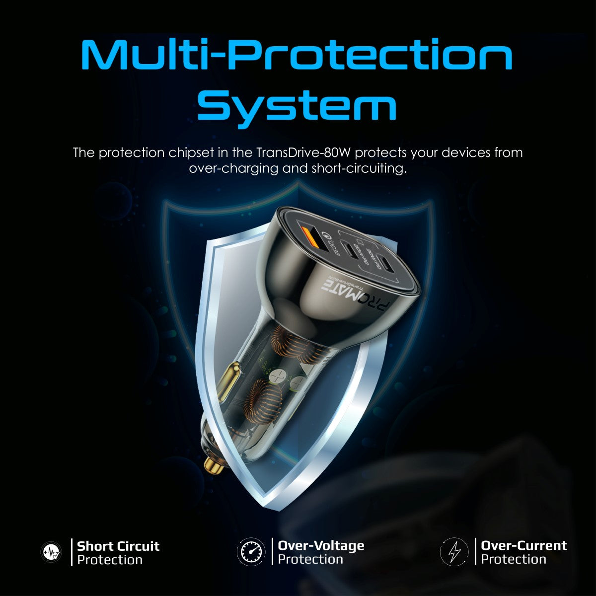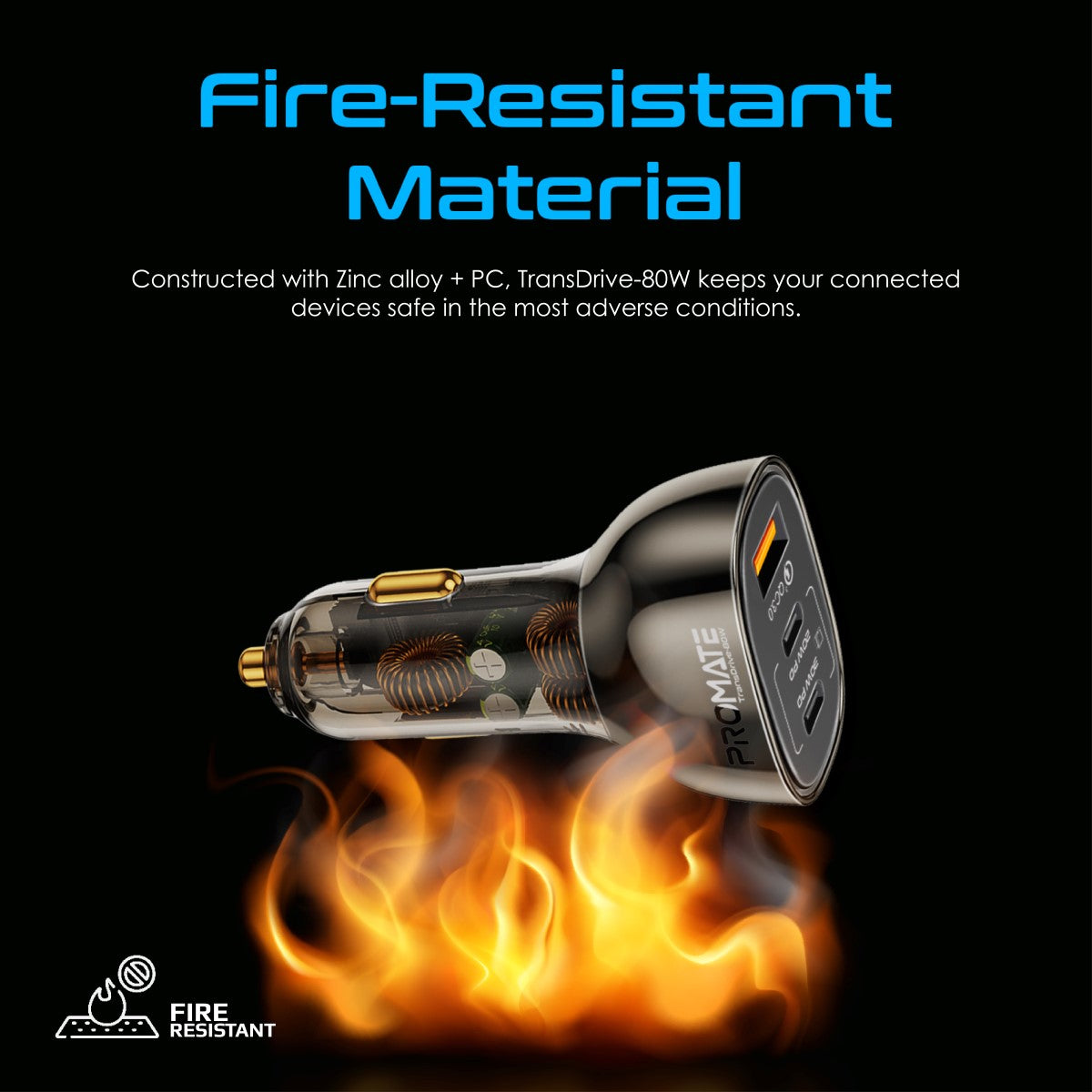TransDrive-80W is the ultimate accessory, featuring dual USB-C ports with 30W and 20W Power Delivery, as well as a 30W Quick Charging 3.0 port, all housed in a distinctive transparent design. This sophisticated car charger can quickly recharge your power-hungry devices such as laptops, tablets, and smartphones while you're on the move. Crafted with premium heat dispersion material and IC Technology, this compact and efficient car charger ensures the safest and speediest charge possible in both ports. With its impressive finish and rapid charging capabilities, TransDrive-80W is the optimal charging solution to enhance your driving experience.